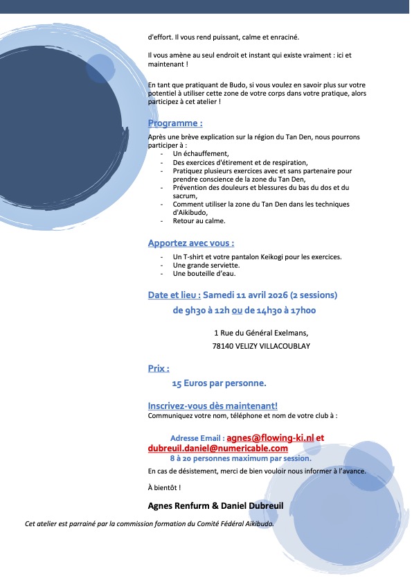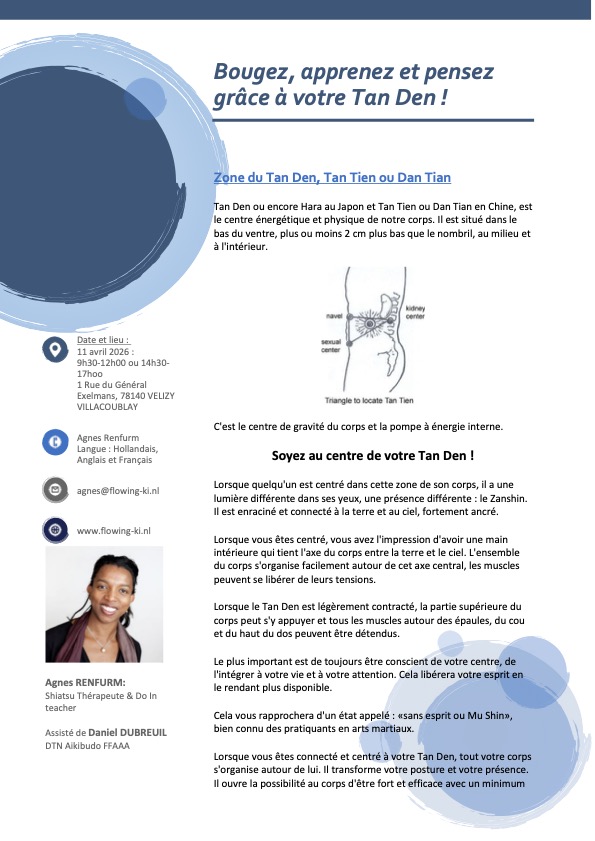 La commission formation diplômante du comité fédéral Aikibudo propose une formation sur le Tan Den pour les pratiquant(e)s d’Aikibudo et de Kobudo. Cette formation vise à mieux comprendre l’importance énergétique du Tan Den dans votre pratique régulière des arts martiaux.